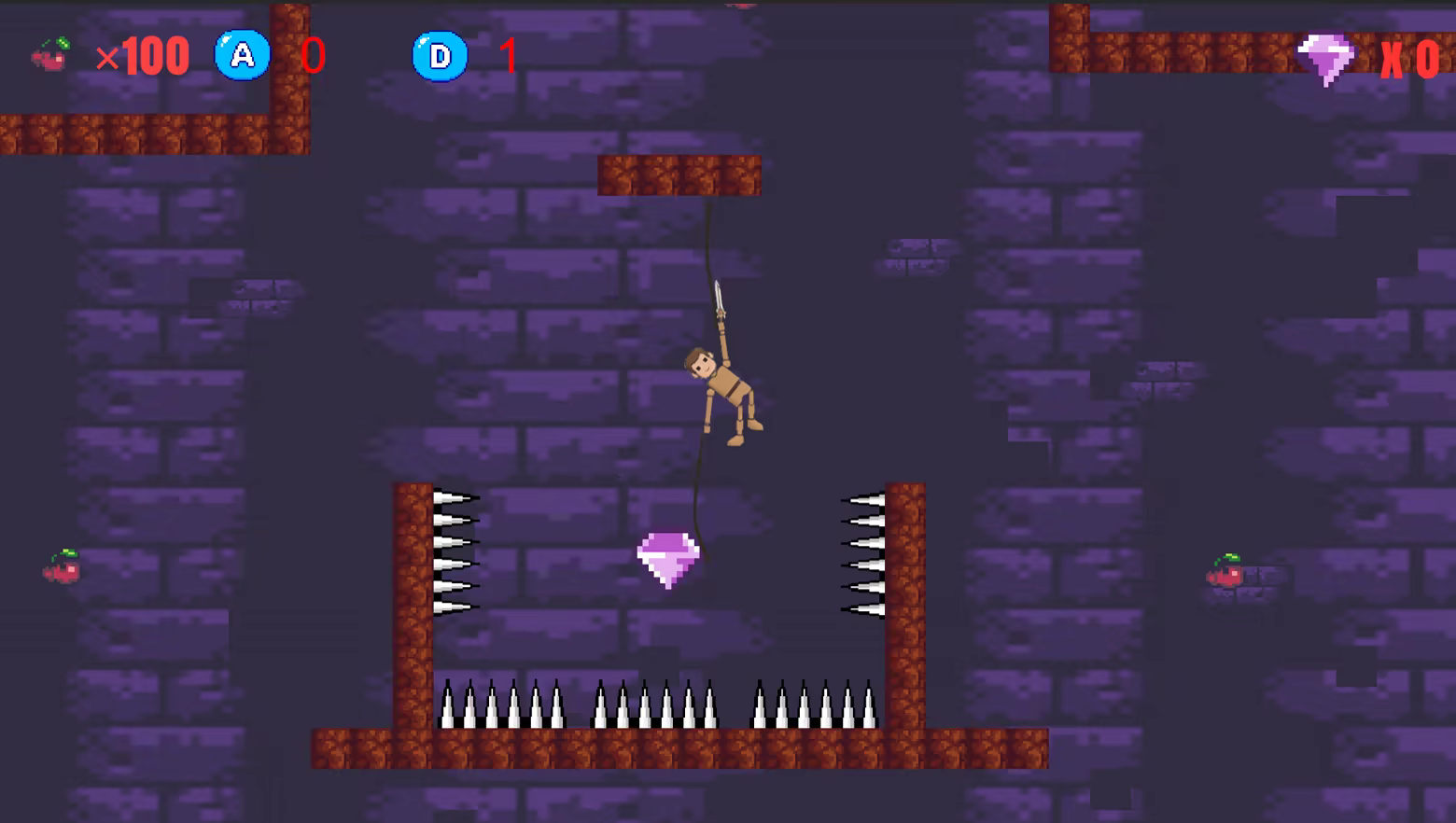 Cherries must be collected directly by the character (not by the ropes). Picking up a cherry restores the player's HP.